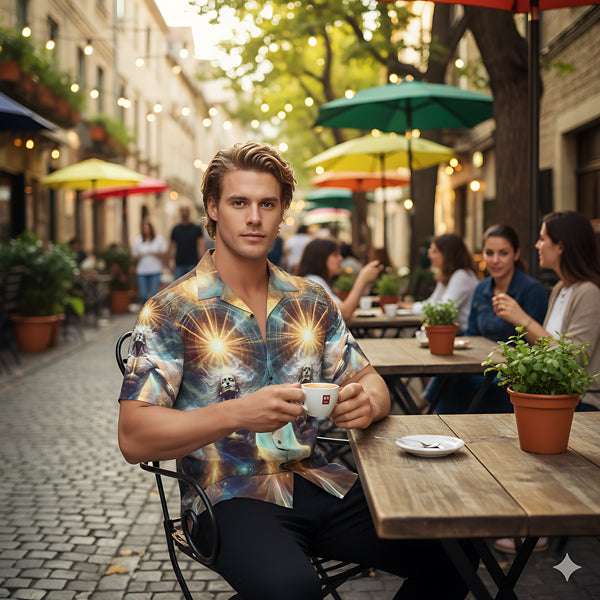 Adorn yourself with a garment from the "Cosmos Within" series and carry a piece of the universe with you. Each shirt acts as a canvas for contemplation and inspiration, illuminating the mind with a symphony of colors and shapes that resonate with the soul. Be captivated by the visual odyssey that celebrates the universal essence within each man and bridges the outer cosmos with inner potential.