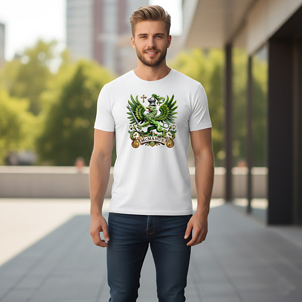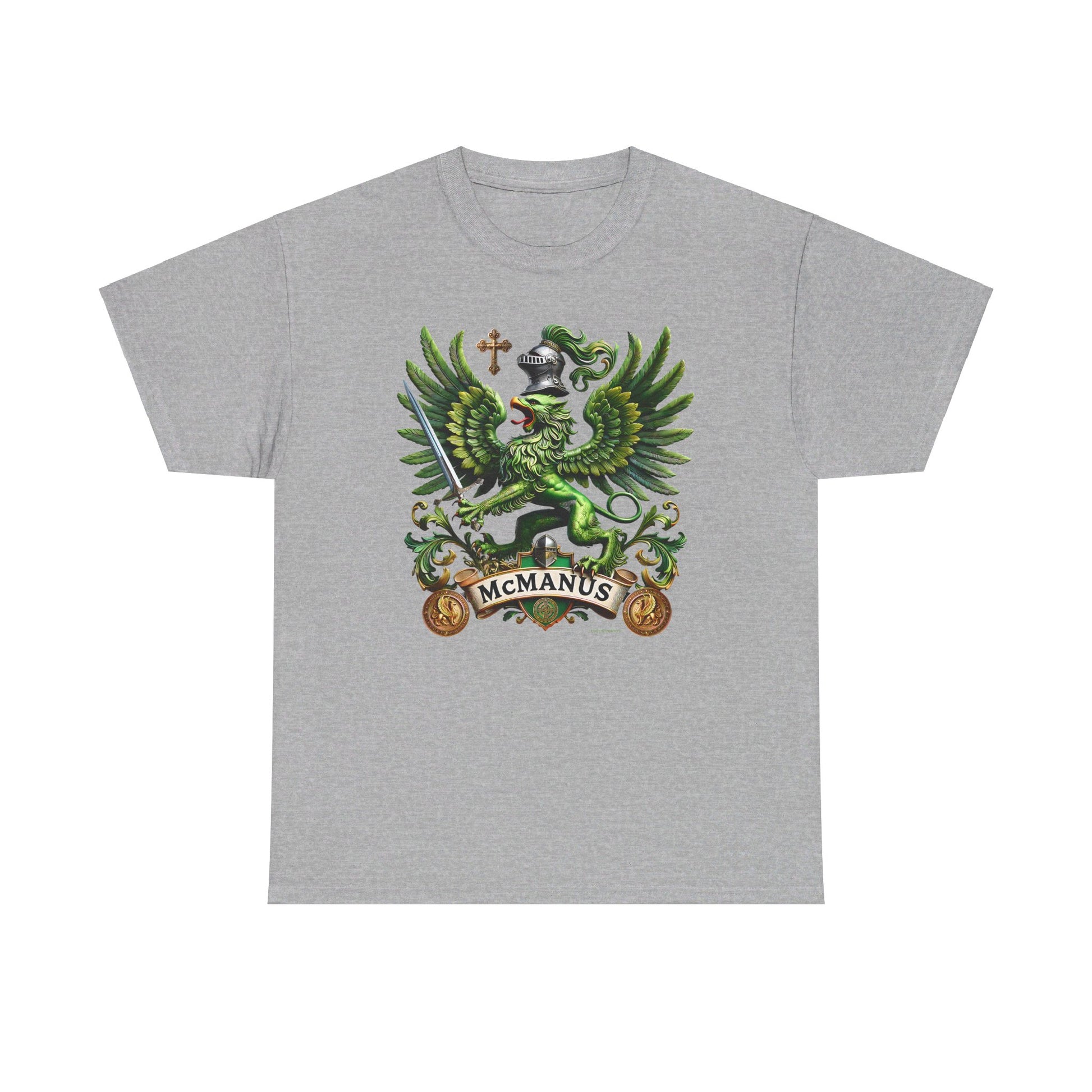 The McManus lineage stretches back through the centuries, deeply embedded in the history and culture of the Celtic lands. Surrounded by intricate scroll-work and emblems of ancient power, the McManus crest is a timeless symbol of the family’s honor and dedication. Each element in the design is carefully chosen to represent the values and legacy passed down through generations. From the sword, a symbol of protection and justice, to the cross, representing faith and resilience, this crest is a testament to the enduring spirit of the McManus clan. The noble helmet and crown atop the crests signifies the clan’s royal history and its role in defending the sovereignty and traditions of the Celtic people. This design is more than just a symbol, it's a piece of history, a celebration of a noble lineage that continues to inspire. The McManus family crest is not only a mark of heritage but also a statement of pride, connecting the past with the present and carrying the legacy forward into the future.